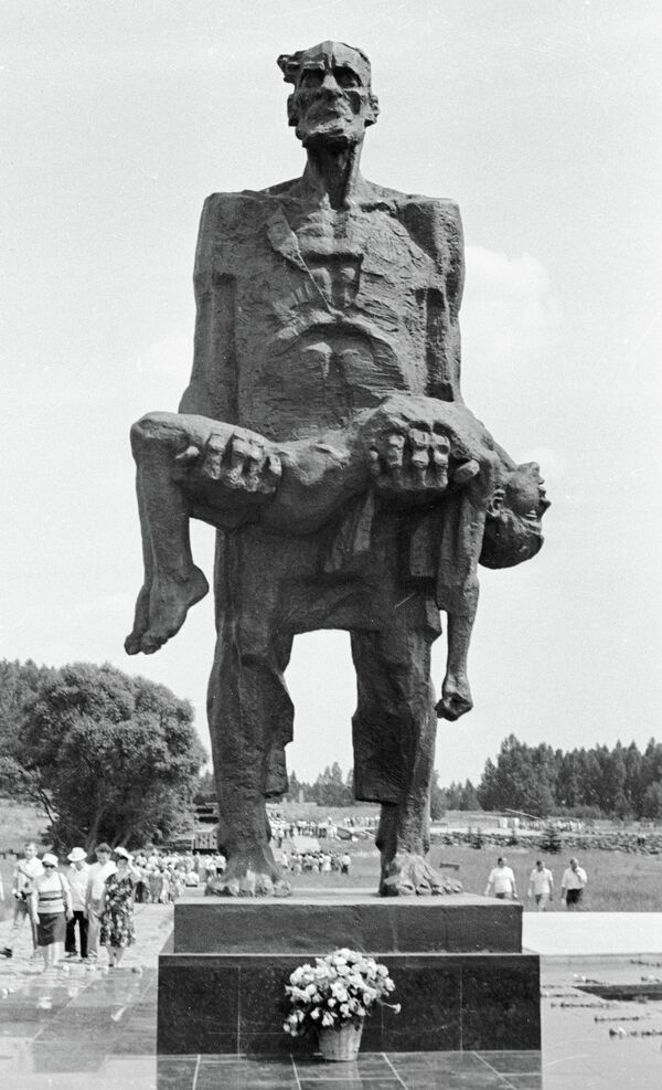 До рокового дня 1943 года это была обычная мирная белорусская деревня, насчитывающая 26 дворов. Утром 22 марта в 6 километрах от нее партизаны обстреляли немецкую автоколонну. В перестрелке погиб немецкий офицер. Вскоре после этого Хатынь окружили каратели. Они согнали в амбар стариков, женщин, детей, заперли и подожгли. В огне погибли 149 человек, в том числе 75 детей, самому младшему 7 недель.