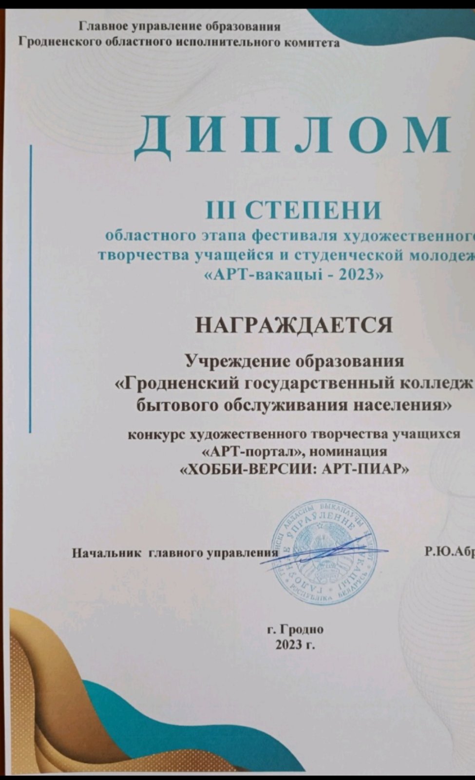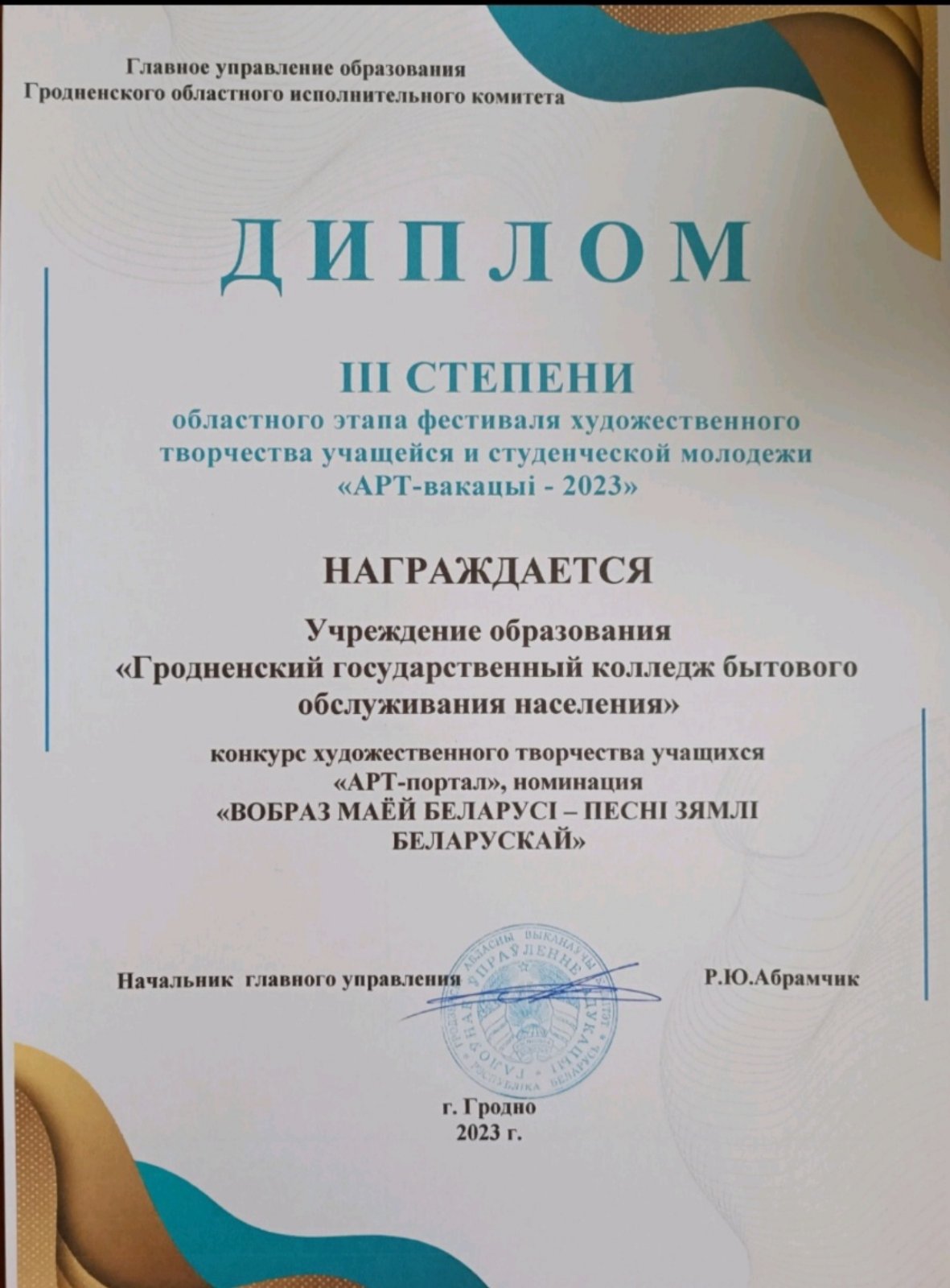 Подведены итоги областного этапа республиканского фестиваля художественного творчества учащейся и студенческой молодежи “Арт-вакацыi-2023”, “Арт- портал”. В номинациях “Вобраз маей краiны – песнi зямлi беларускай” и номинации “Хобби -версия: АРТ-ПИАР” работы учащихся нашего колледжа отмечены Дипломами III степени.
