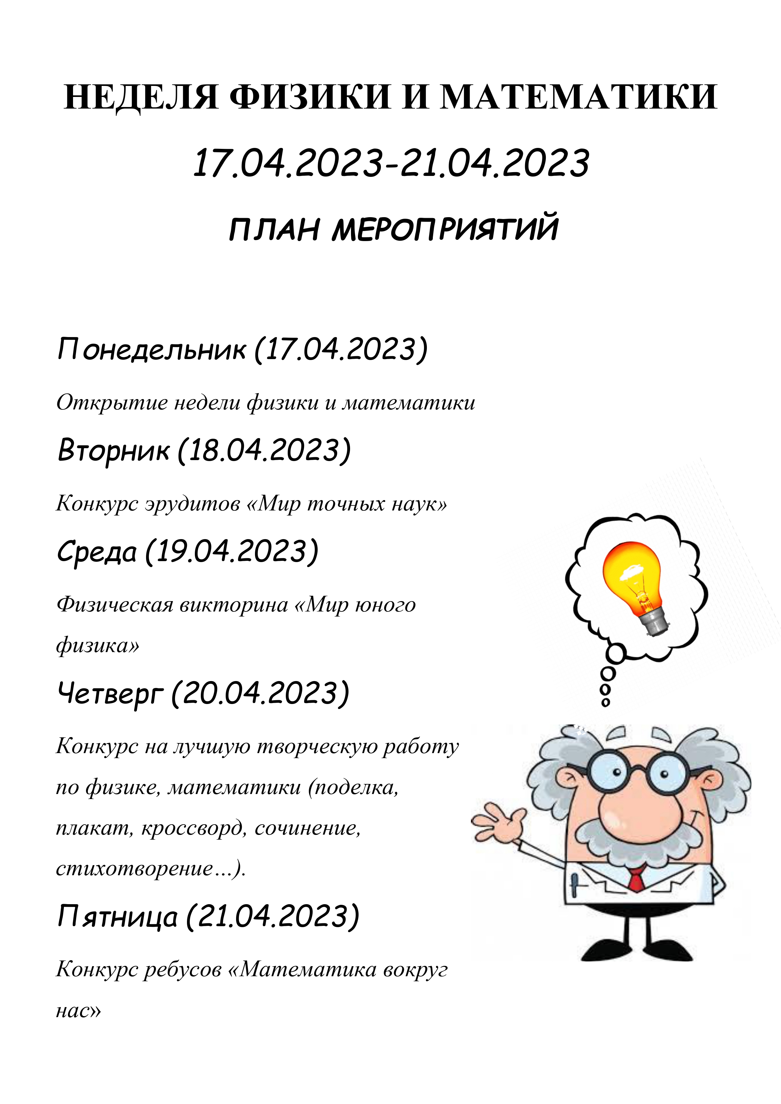 /// Проходит неделя математики и физики с 17.04.2023 по 21.04.2023. Учащимся 1, 2 – курсов предлагается принять участие в следующих мероприятиях
