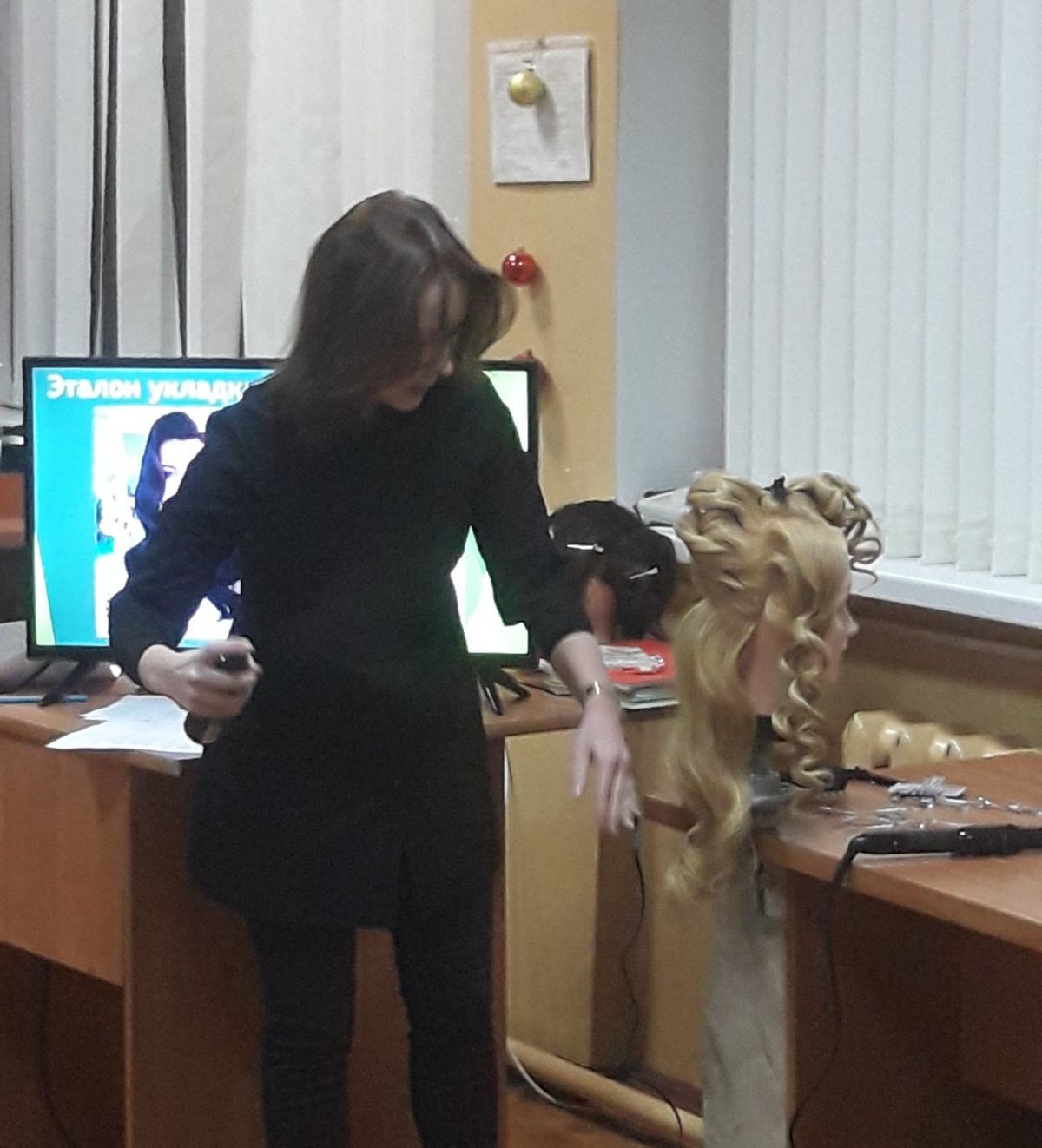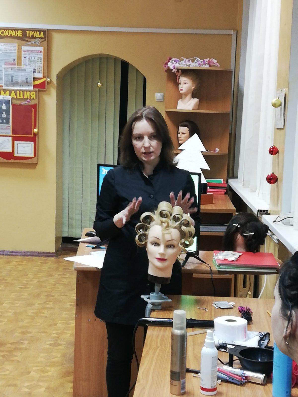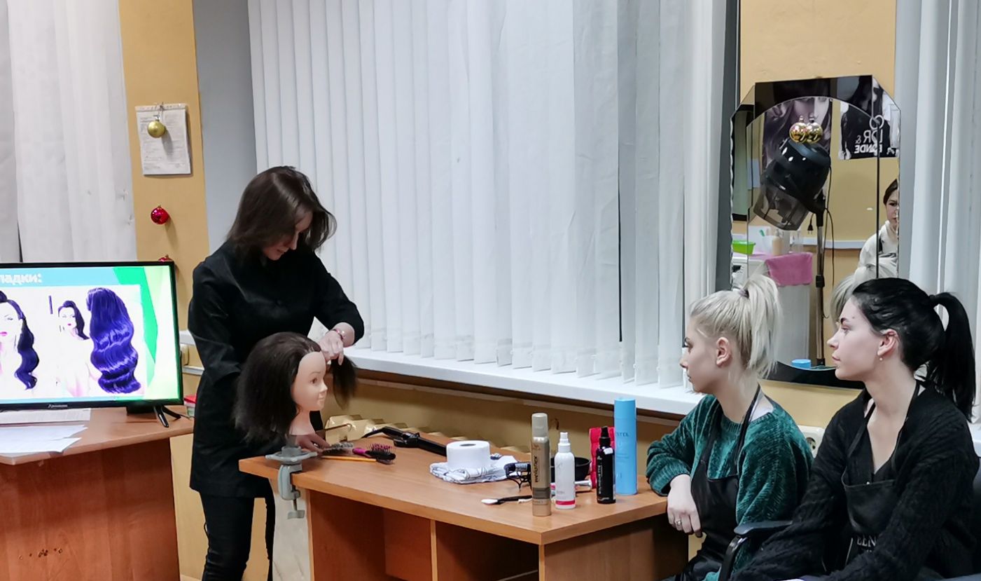 Сегодня, 23 декабря, согласно плана работы аттестационной комисси состоялось открытое занятие по учебному предмету “Производственное обучение” по специальности “Парикмахерское искусство и декоративная косметика”. Окстина Елена Марьяновна пригласила коллег в учебную группу № 14 парикмахер/мастер по маникюру и представила варинат работы по теме “Модельная укладка волос “Голливудская волна”. На учебном занятии учащиеся освоили следующие трудовые приемы: