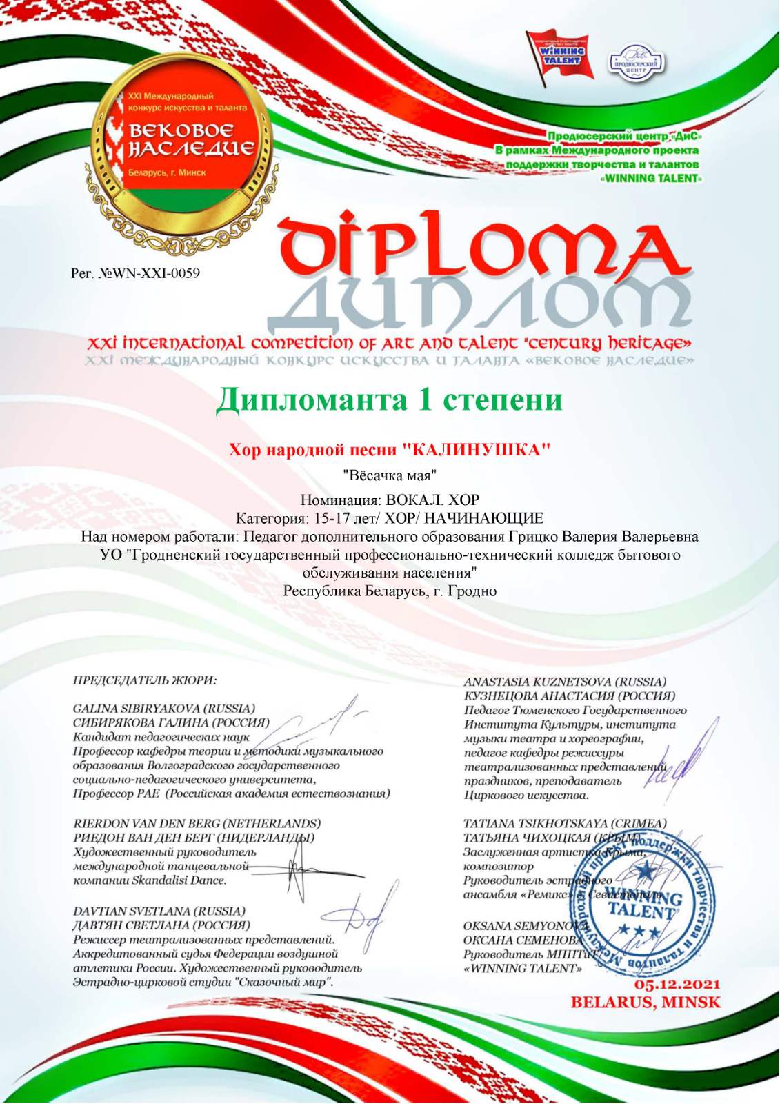 У апошнiя гадзiны адыходзячага года наш настунiк дадатковай адукацыi разам з хорам народнай песнi “Калiнушка” вiншуюць наш калектыу перамогамi. Вялiкi дзякуй Валерыi Валер’еуне i удзельнiкам гуртка.