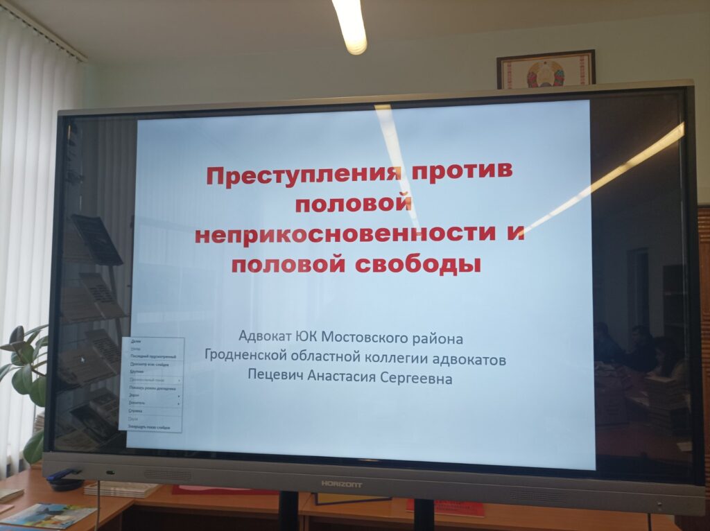 13.12.2023 состоялась встреча с адвокатом ЮК Мостовского района Гродненской областной коллегии адвокатов Пецевич Анастасией Сергеевной на тему ” Преступления против половой неприкосновенности и половой свободы”