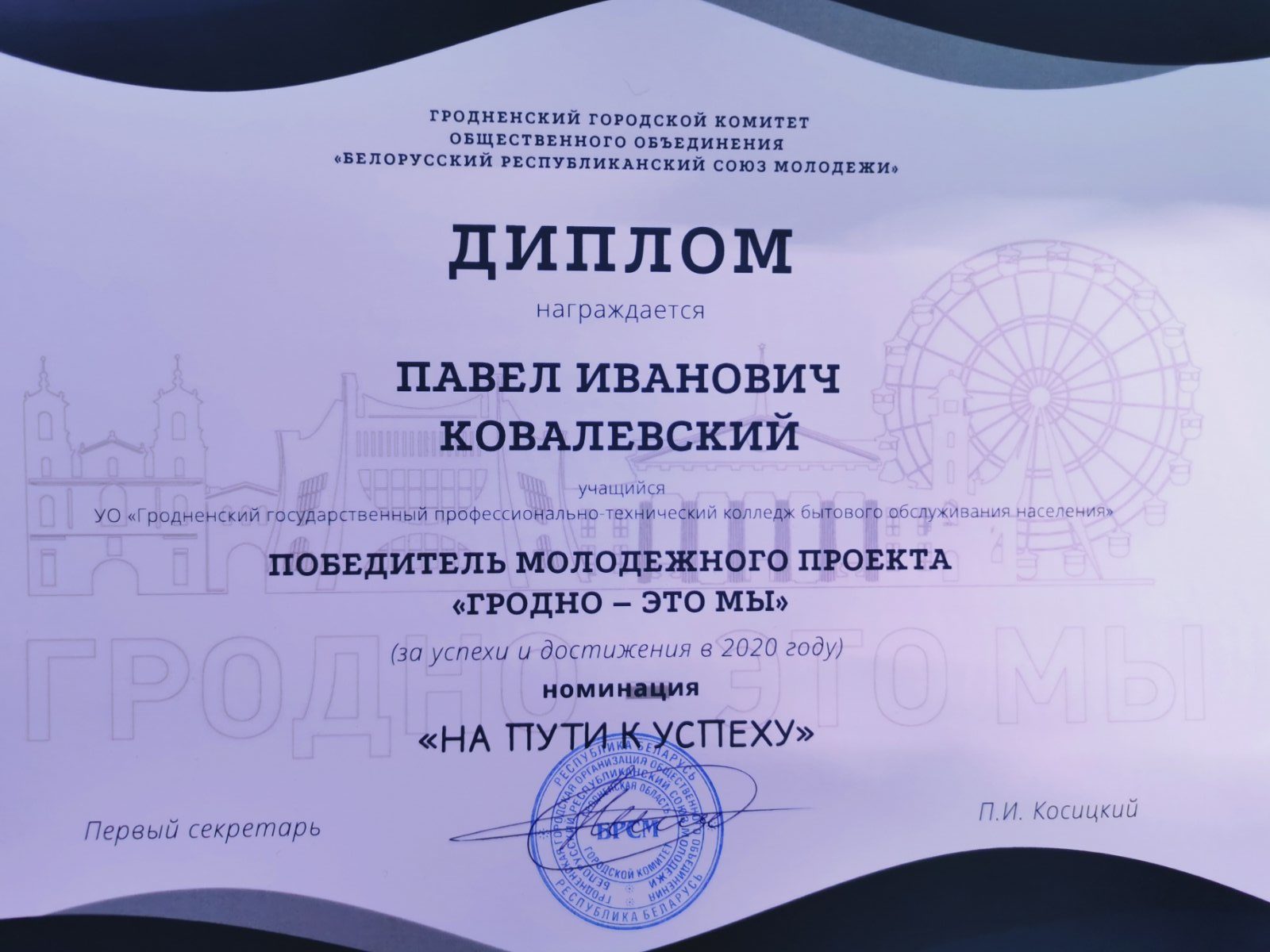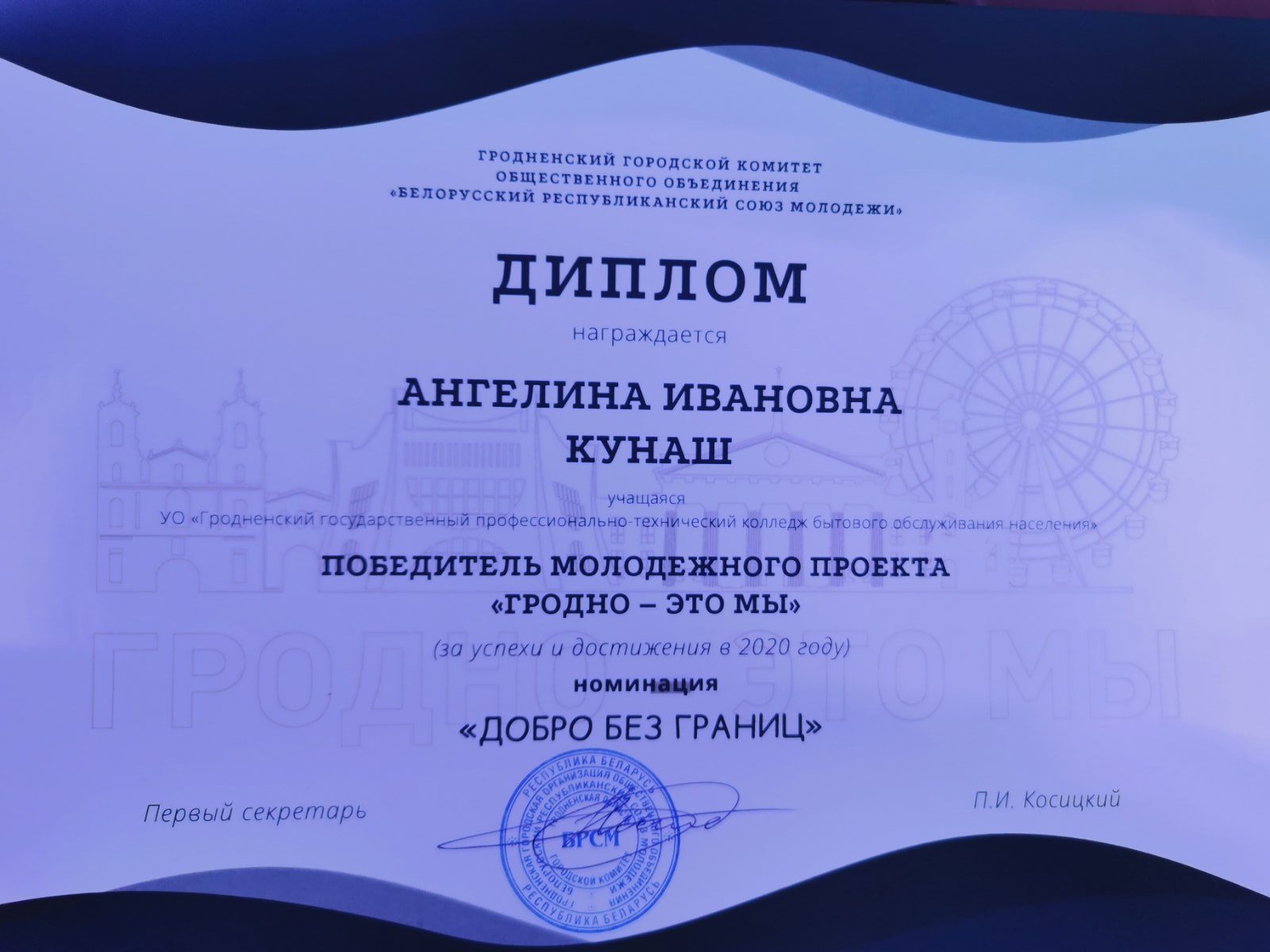 Подведены итоги прошедшего городского молодежного проекта “Гродно – это мы!”. Поздравляем финалистов нашего колледжа: Приписнову Елену Викторовну, секретаря ПО ОО”БРСМ” колледжа, Ковалевского Павла учащегося группы 17м/к, Сак Ангелину учащуюся группы 13ш/п, Кунаш Ангелину учащуюся группы 18х/м и участников любительского народного литературно – публицистического объединения ” Беспокойные сердца”.
