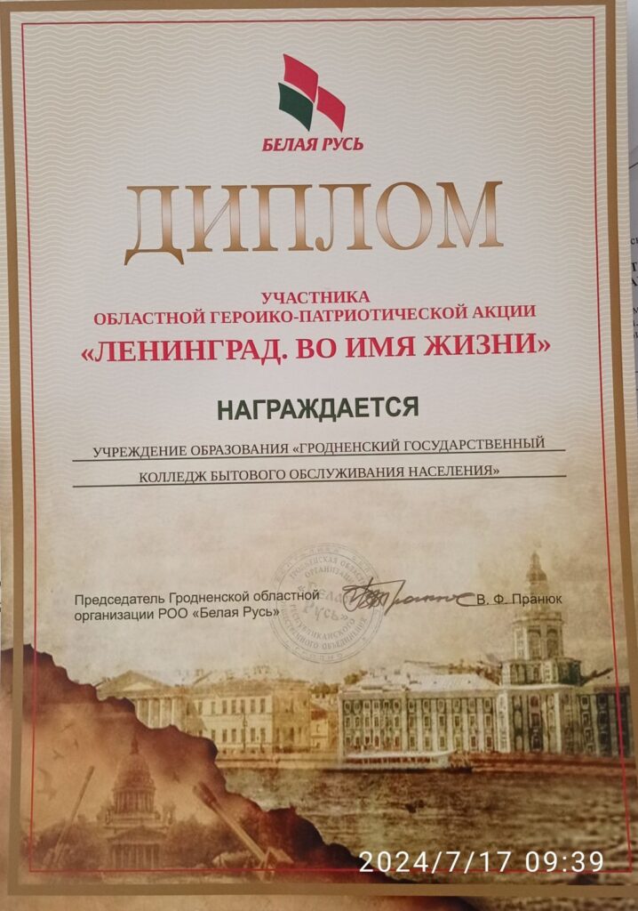 В июне 2024 подведены итоги областной героико-патриотической акции “ЛЕНИНГРАД. ВО ИМЯ ЖИЗНИ”. Работы учащихся и педагогов нашего колледжа отмечены Диплом участника.