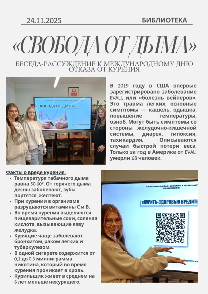 24 ноября прошло мероприятие к Международному дню отказа от курения “Свобода от дыма”. Беседу-рассуждение подготовила и провела библиотекарь Хут Т.Е. В мероприятии участвовали учащиеся 26 группы швея/парикмахер и куратор группы Мартинович Г.В.