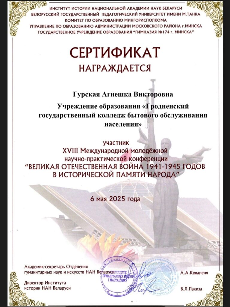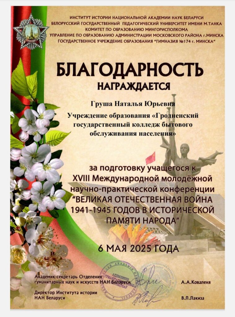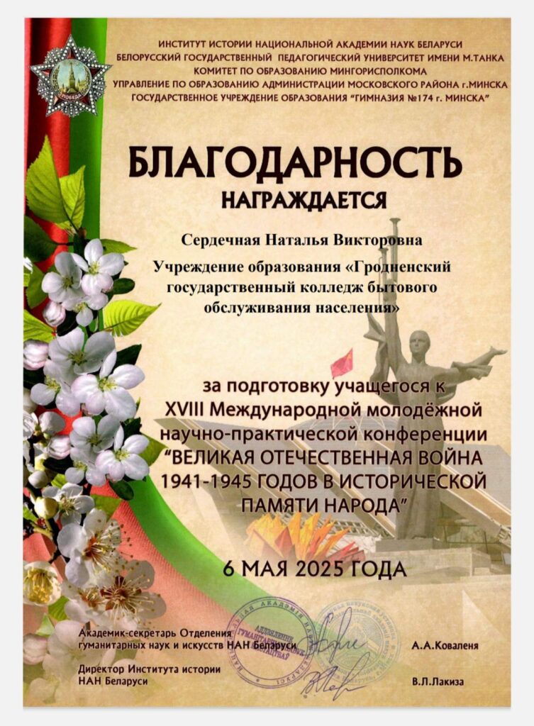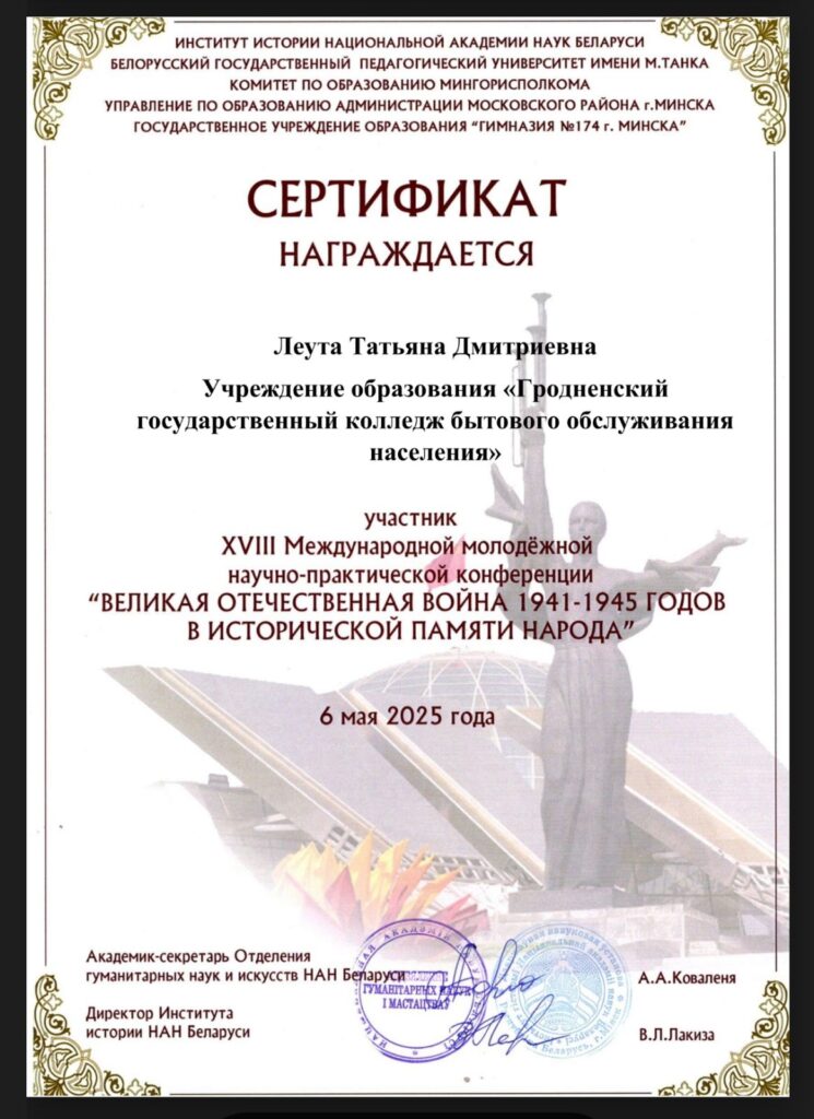С 12.04.2025 по 17.04.2025 учащиеся колледжа Леута Татьяна и Гурская Агнешка принимали участие в XVIII Международной молодежной научно-практической конференции “Великая Отечественная война 1941 – 1945 годов в исторической памяти народа” (к 80-летию Победы советского народа в Великой Отечественной войне)». По итогам конкурса исследовательская работа учащихся “Зинаида Тимофеевна Судакова. Ей досталась нелегкая участь солдата” отмечена сертификатами участника, а педагоги подготовившие учащихся награждены благодарностью.