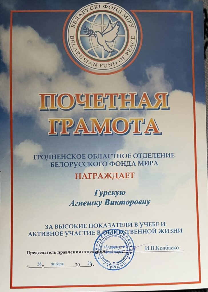 28.01.2026 состоялась торжественная церемония вручения стипендии Гродненского областного объединения”Белорусский фонд мира”, одаренным и талантливым детям, учащимся и студентам Гродненских государственных учебных учреждений. В числе стипендиатов учащаяся второго курса группы №26 Гурская Агнешка, участник театра моды “Образ”, волонтер отряда “Милосердие”, победитель областных, республиканских и международных конкурсов гражданско-патриотической направленности.
